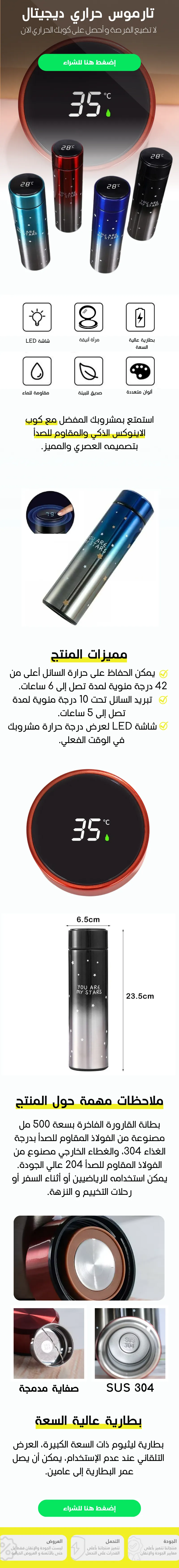 حافظ على حرارة مشروبك طوال اليوم مع زجاجة حرارية ذكية مصنوعة من الفولاذ المقاوم للصدأ، بسعة 500 مل، مزودة بشاشة LED رقمية تعرض درجة الحرارة بلمسة واحدة. تصميم أنيق وعملي يناسب جميع احتياجاتك اليومية، سواء كنت في المكتب أو في الخارج.